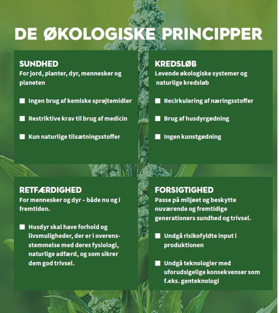 Principperne er formuleret af den internationale økologiorganisation IFOAM. Du kan læse mere om de økologiske principper her.