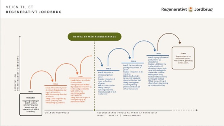 At omlægge sin landbrugspraksis til regenerativ dyrkning er en proces, der kan bestå af mange trin. Foreningen for Regenerativt Landbrug har lavet nedenstående model med forskellige trin på vejen mod regenerativt jordbrug.